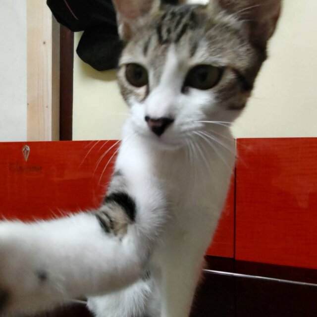 甘えん坊で好奇心旺盛。毎日何か発見し遊んでます。成猫にとても甘えます。