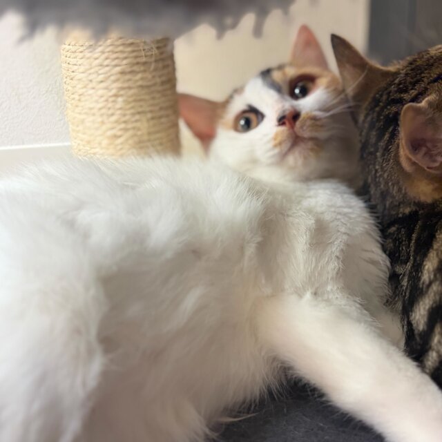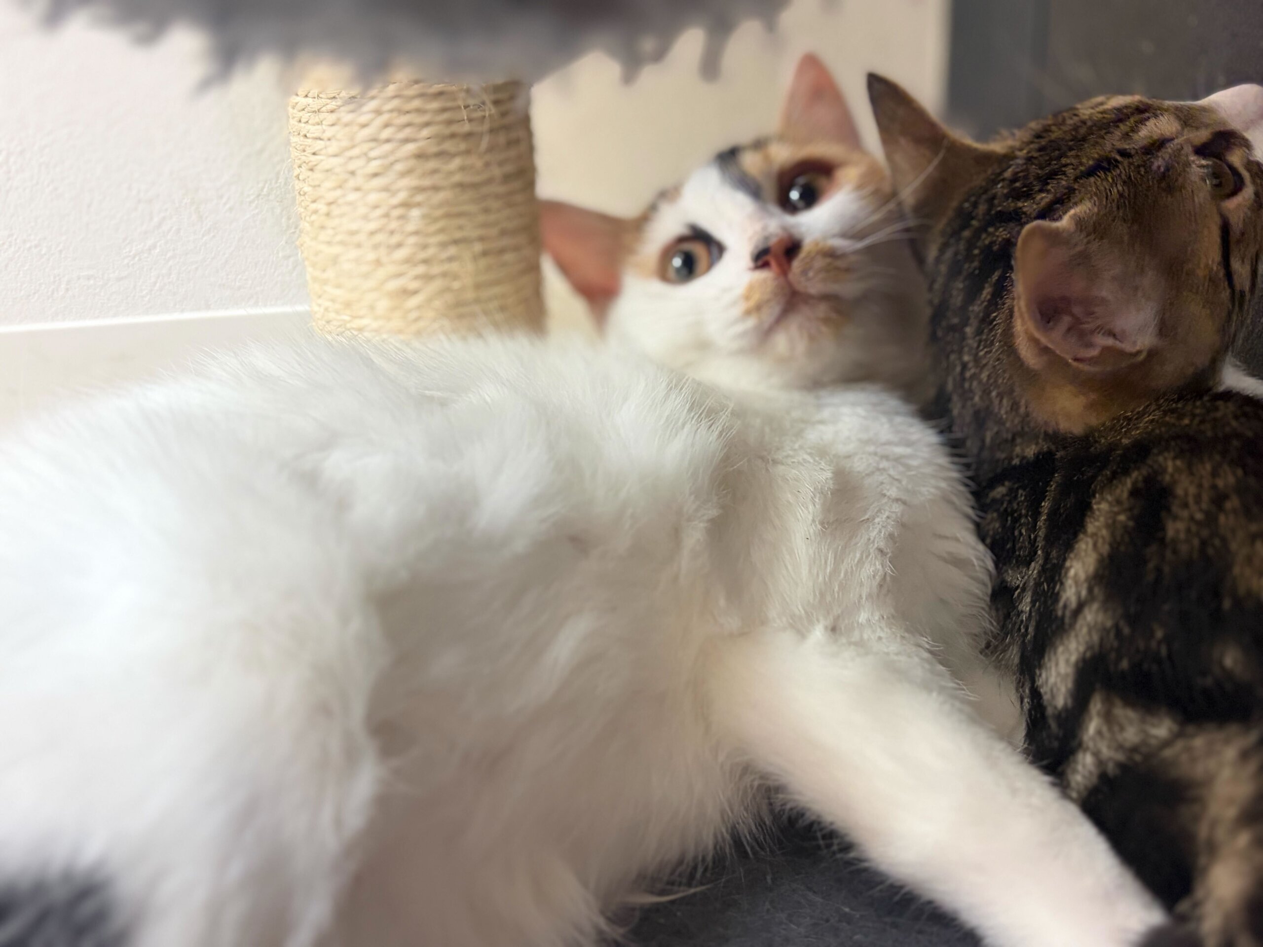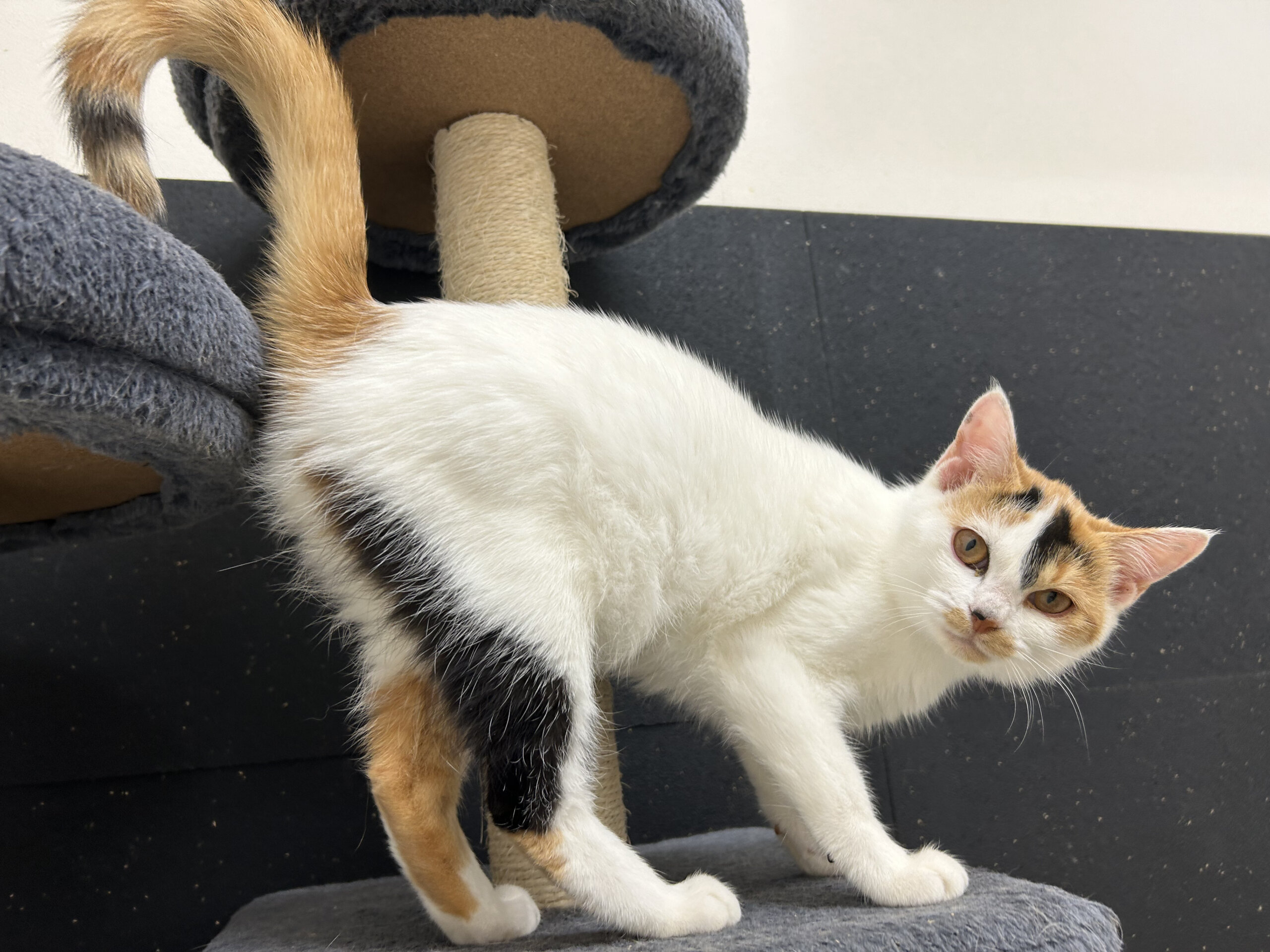 頭が三毛、尻尾は茶とらのとっても美人さんな女の子です!胴体は白猫ちゃん。