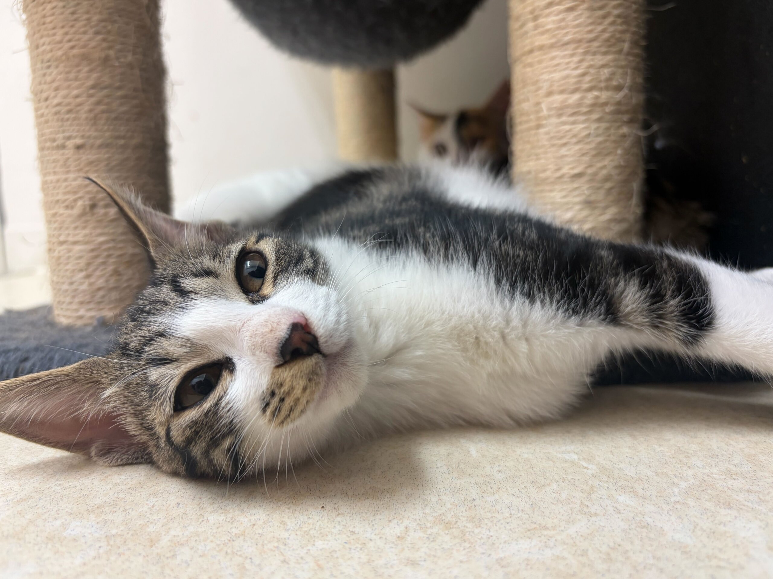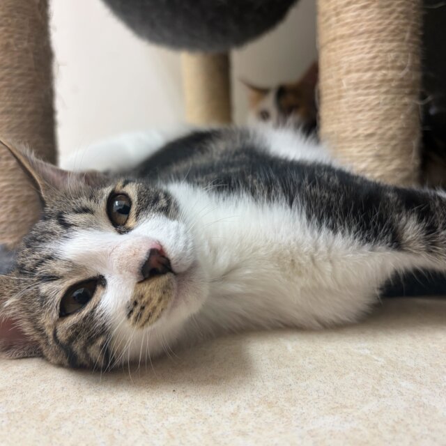 懐っこく甘えん坊。とっても元気いっぱいで子猫部屋で他の猫ちゃんとパワフルに遊んでいます。