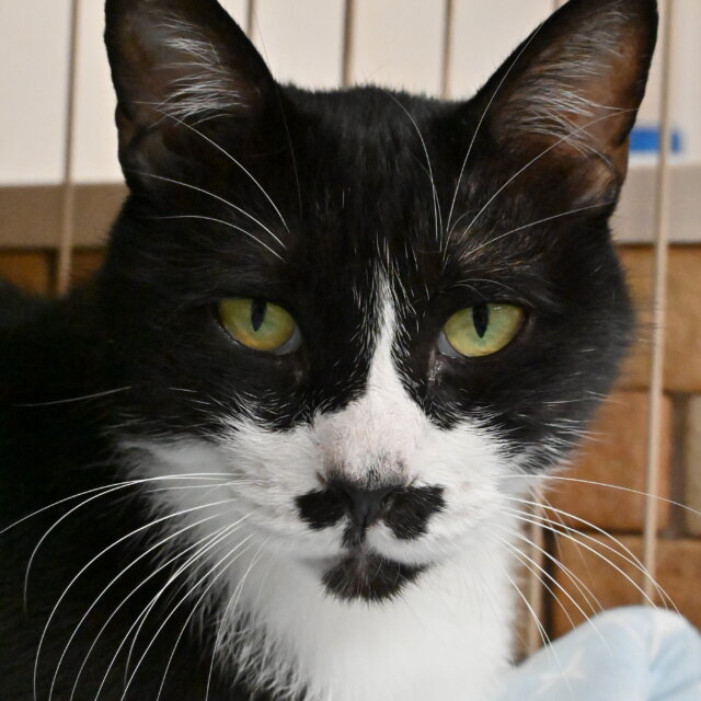 紳士のようなおヒゲが特徴。生まれた時から人の家で生活してきたので、人に甘えるのが何よりも好きです。初対面でも、一度撫でてもらえば味を占め、「もっと、もっと」と簡単には解放してくれない、ちょっとわがままな甘えん坊です。