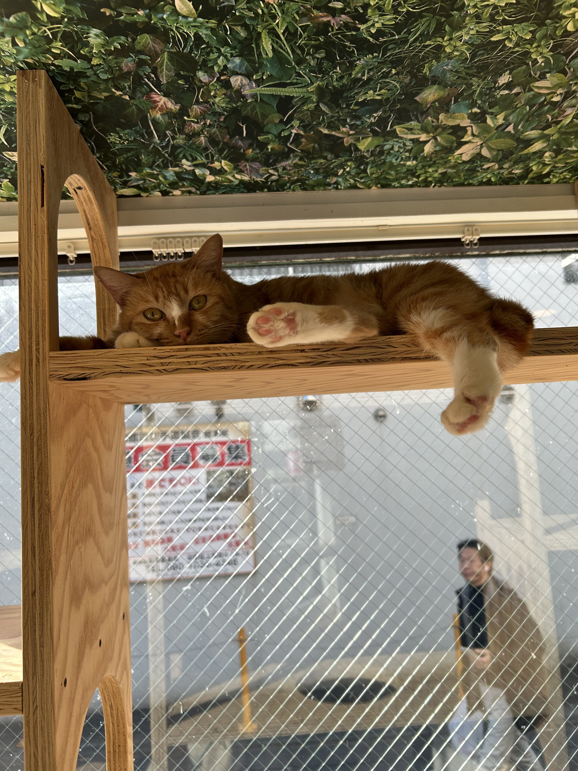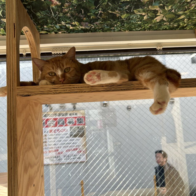大人しい性格で、普段はキャットウォークの高いところでのんびりお昼寝していることが多いです。