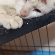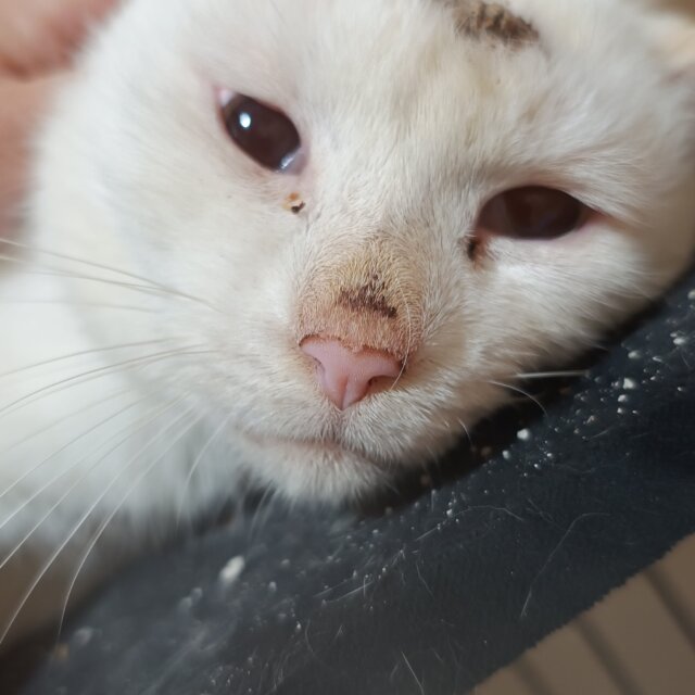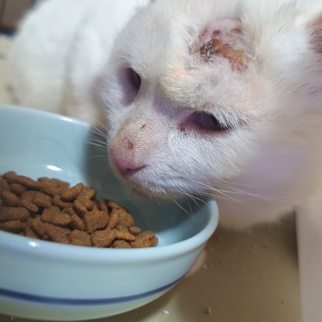 人に優しくしてもらった経験が少なかったのか、頭に大きなケガを負った状態で保護した白猫の女の子です。現在は治療中で、ケガはしっかり回復に向かっています。
