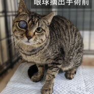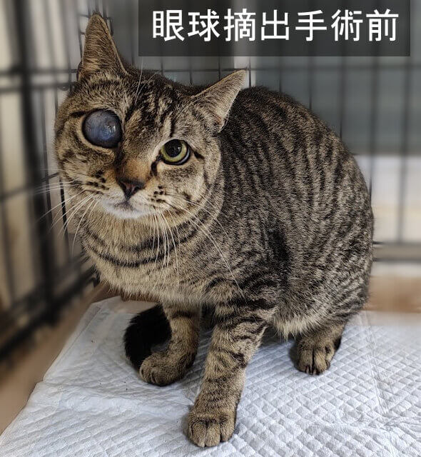 猫が繁殖している住宅地にてTNRのため捕獲しましたが、片目が飛び出ており治療が必要だったため保護となりました。