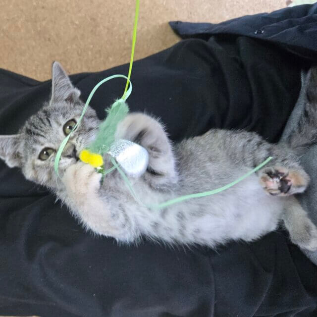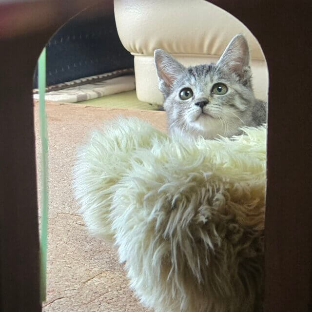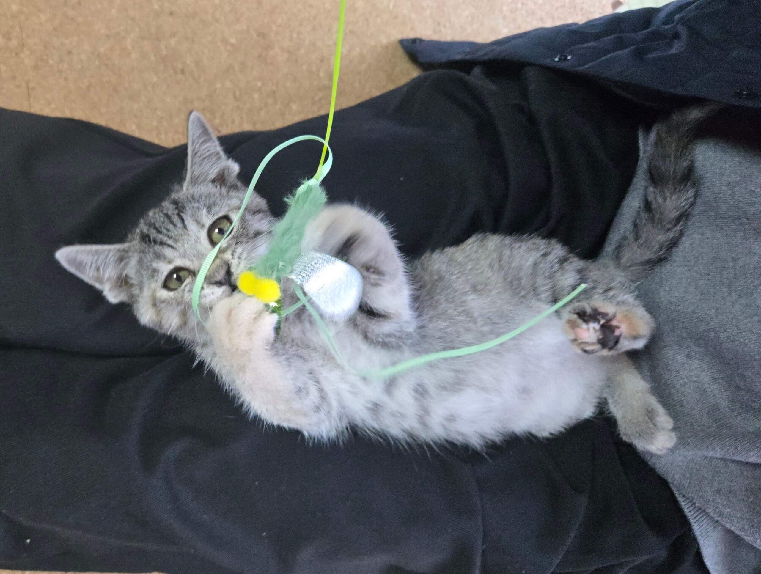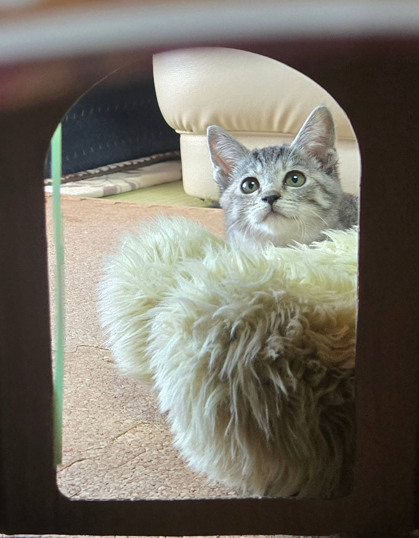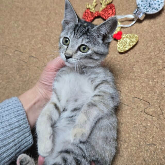 元気いっぱいで人が大好きな子猫「ななちゃん」です。サバトラ柄で、頭にはちょこんと白毛が付いています。