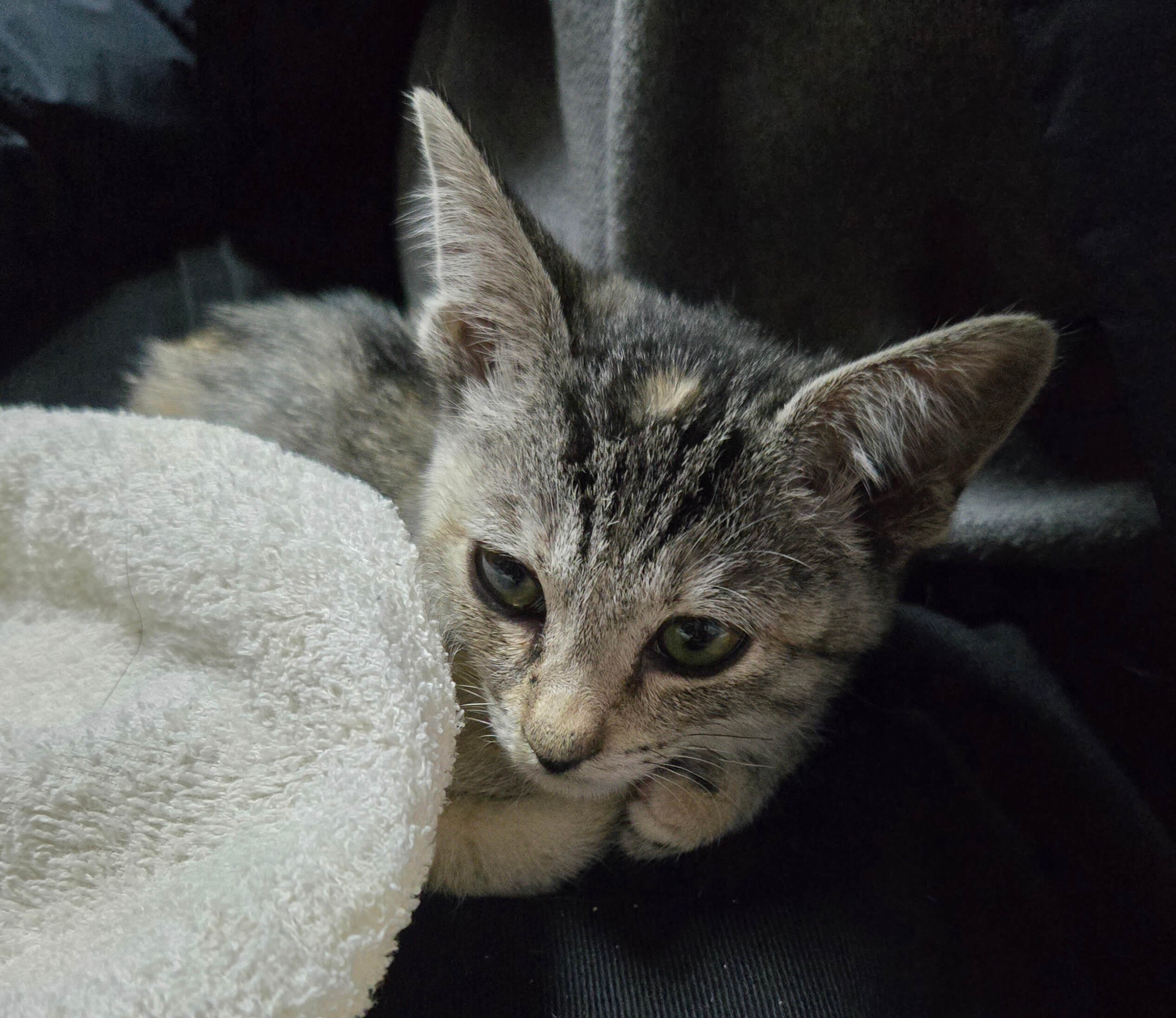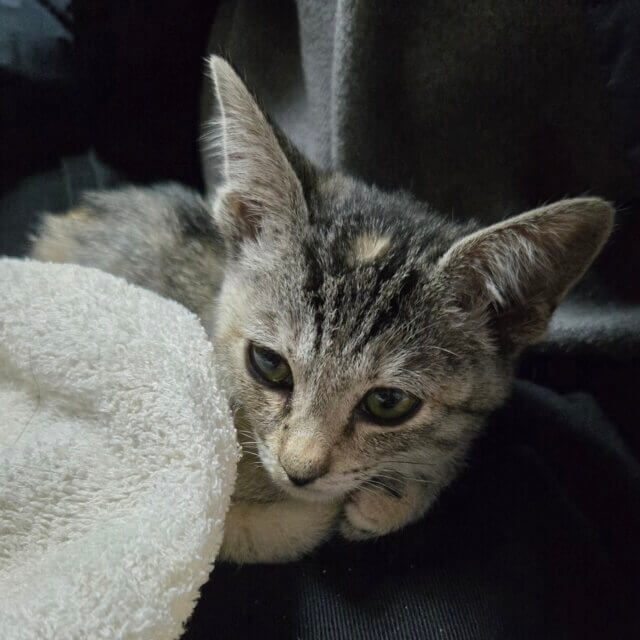 2025年11月下旬、1匹だけで居たところを保護しました。親猫や兄弟の姿はなく、猫風邪で目やにが固まっている状態でした。現在は回復して元気に過ごしています。