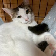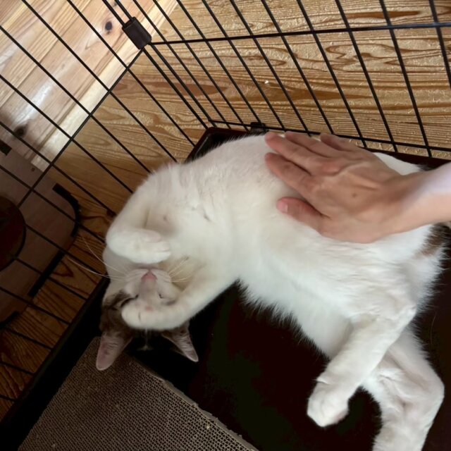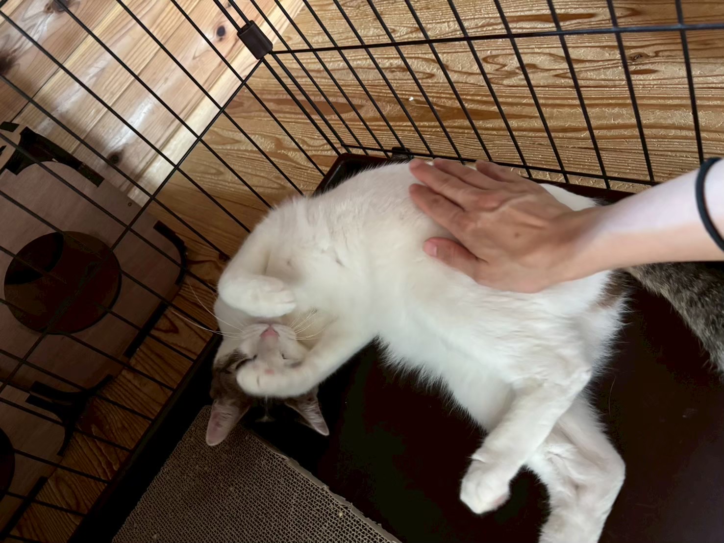 初めは少し人見知りしますが、安心できるとそばに寄ってきてはゴロンとへそ天ポーズはお決まりのポーズになっています。人のそばに寄り添って他の猫たちとも穏やかに過ごしています。