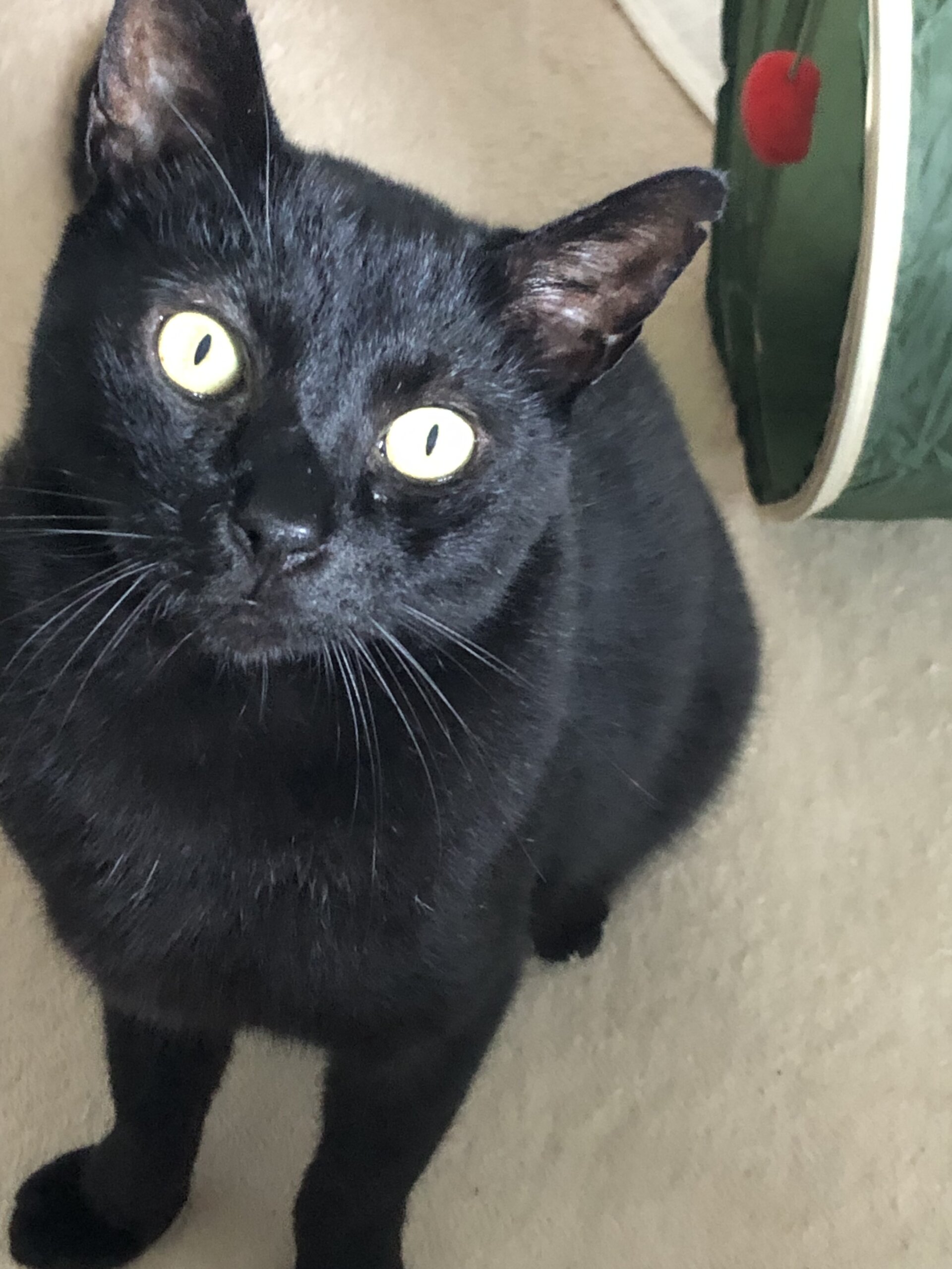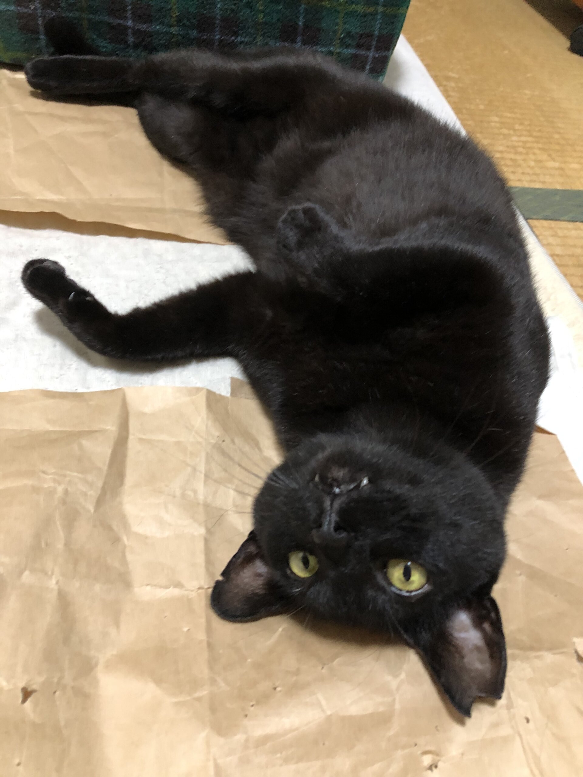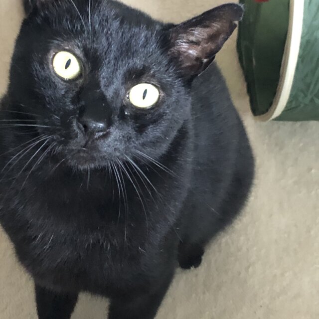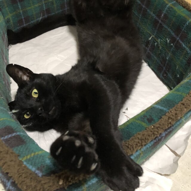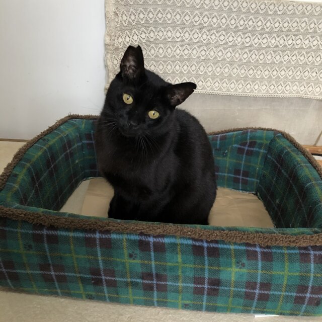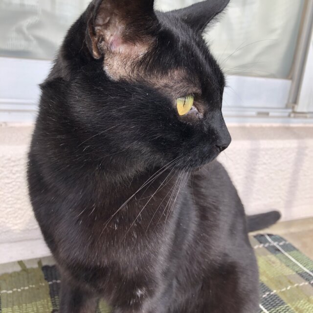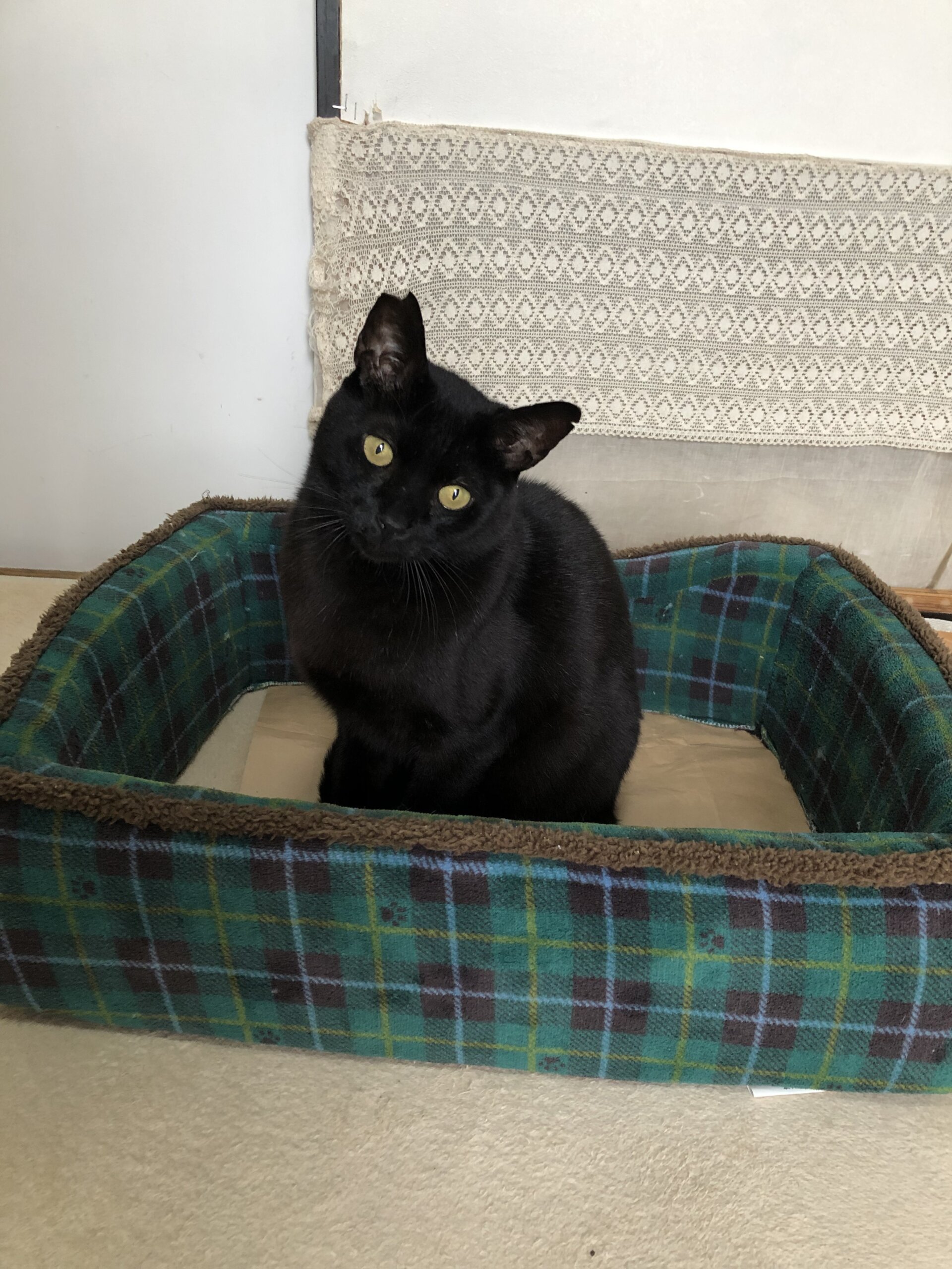 落ち着いた性格の黒猫の男の子です。話しかけるといろんな声で必ずお返事をしてくれます。