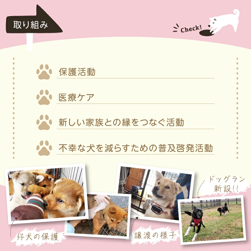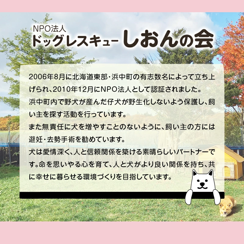 NPO法人ドッグレスキュー しおんの会は2006年に地元有志によって設立され、2010年にはNPO法人として認証された信頼ある団体です。寄付金は主に以下の活動に充てられます。