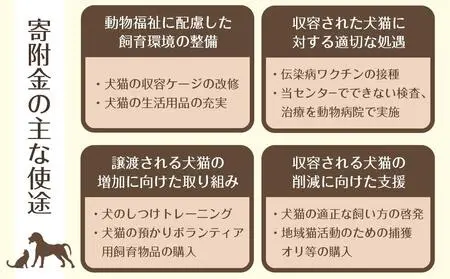 皆様からの寄付金は、収容された犬猫への感染症予防ワクチン接種、センターでは対応できない疾病検査・治療・手術の外部委託、収容環境の改善(ケージ導入・修繕、爪とぎ・しつけ用品の充実)、しつけが不十分な犬への専門トレーニング、地域猫活動の推進、預かりボランティアへの飼育器材貸与、動物愛護教育用の絵本・教材購入など、犬猫の譲渡促進と収容数削減に直結する事業に活用されます。