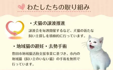 あなたの「ふるさと納税」が、一頭の犬の新しい家族との出会いになり、一匹の子猫が生き延びるためのワクチンになり、地域で暮らす猫たちの不幸な繁殖を防ぐ手術費用になります。