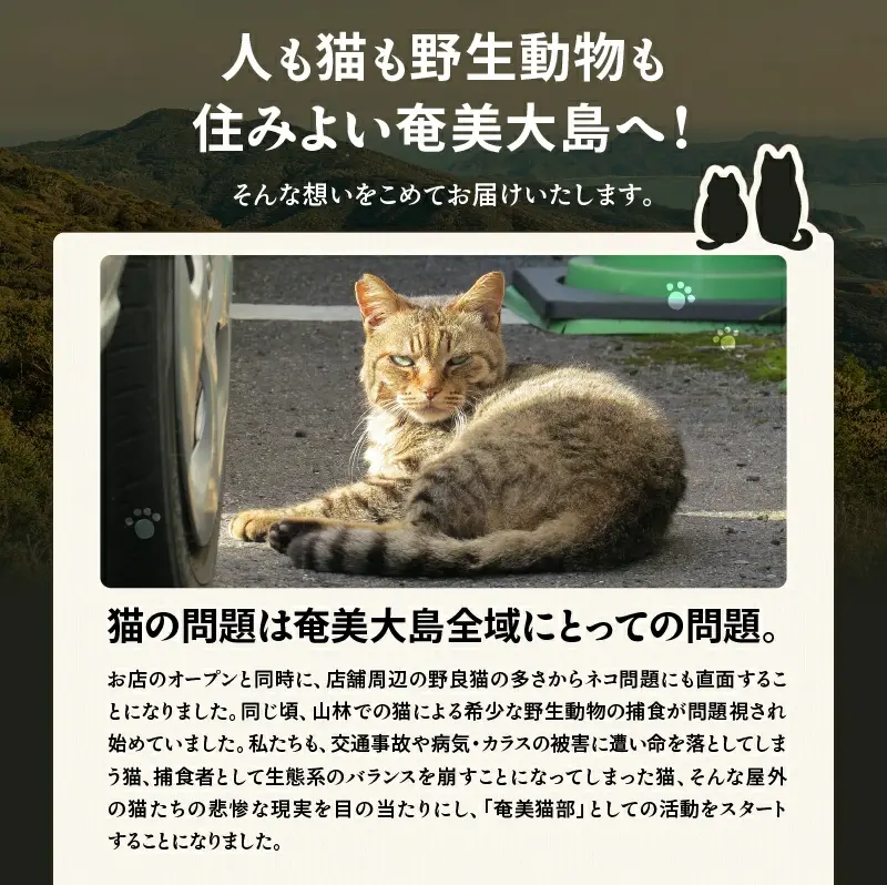 奄美の味覚を楽しみながら、島の保護猫たちに今日のごはんを届けてみませんか。