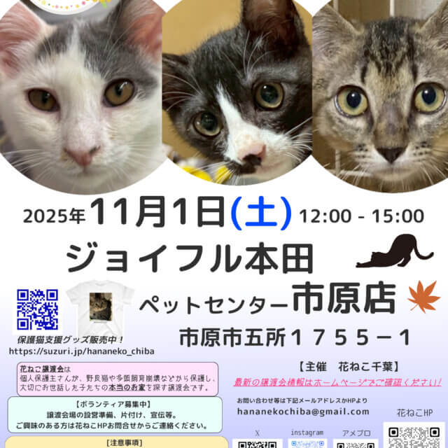 花ねこ譲渡会 募集番号:67842 掲載日:2025/10/05 開催日 2025/11/1 時間 12:00 - 15:00 場所 千葉県市原市五所1755-1 会場名 ジョイフル本田 ペットセンター市原店 内容 花ねこ譲渡会は、個人保護主さんが保護して大切にお世話した猫の「本当のお家」を探す譲渡会です。是非一度遊びに来てください。 ご予約は不要です。 開催日: 2025/11/1 時間: 12:00 - 15:00 場所: 千葉県市原市五所1755-1 会場名: ジョイフル本田 ペットセンター市原店 スポンサーリンク この譲渡会情報をSNSで広めよう! Twitterでシェア Facebookでシェア はてなブックマーク LINEで教える 投稿者:花ねこ千葉 この投稿者の情報を見る