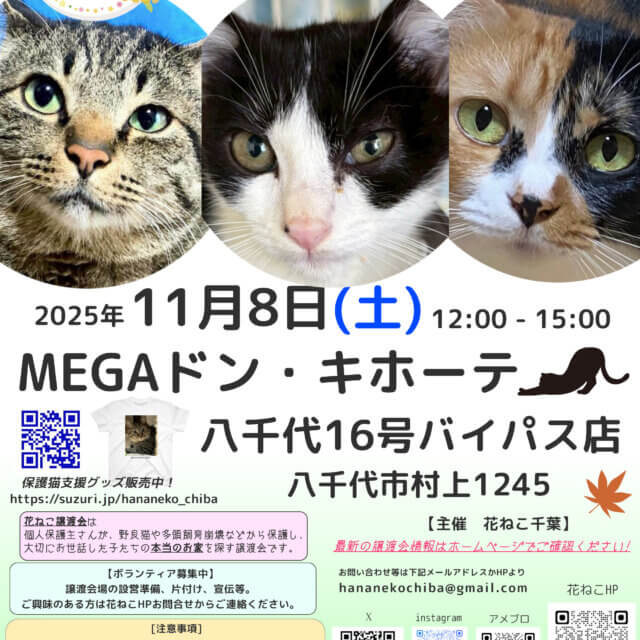 花ねこ譲渡会 募集番号:67844 掲載日:2025/10/05 開催日 2025/11/8 時間 12:00 - 15:00 場所 千葉県八千代市村上1245 会場名 MEGAドンキ・ホーテ八千代16号バイパス店 内容 花ねこ譲渡会は、個人保護主さんが保護して大切にお世話した猫の「本当のお家」を探す譲渡会です。是非一度遊びに来てください。 ご予約は不要です。 開催日: 2025/11/8 時間: 12:00 - 15:00 場所: 千葉県八千代市村上1245 会場名: MEGAドンキ・ホーテ八千代16号バイパス店 スポンサーリンク この譲渡会情報をSNSで広めよう! Twitterでシェア Facebookでシェア はてなブックマーク LINEで教える 投稿者:花ねこ千葉 この投稿者の情報を見る