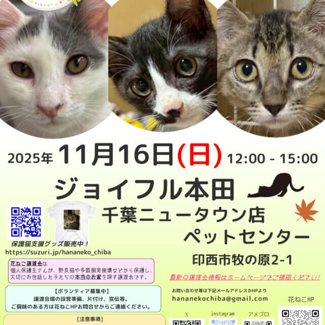 花ねこ譲渡会 募集番号:67848 掲載日:2025/10/05 開催日 2025/11/16 時間 12:00 - 15:00 場所 印西市牧の原2-1 会場名 ジョイフル本田 千葉ニュータウン店 ペットセンター 内容 花ねこ譲渡会は、個人保護主さんが保護して大切にお世話した猫の「本当のお家」を探す譲渡会です。是非一度遊びに来てください。 ご予約は不要です。 開催日: 2025/11/16 時間: 12:00 - 15:00 場所: 印西市牧の原2-1 会場名: ジョイフル本田 千葉ニュータウン店 ペットセンター スポンサーリンク この譲渡会情報をSNSで広めよう! Twitterでシェア Facebookでシェア はてなブックマーク LINEで教える 投稿者:花ねこ千葉 この投稿者の情報を見る