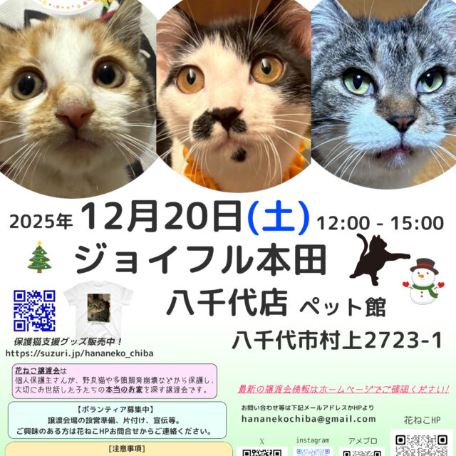 花ねこ譲渡会 募集番号:69265 掲載日:2025/11/05 開催日 2025/12/20 時間 12:00 - 15:00 場所 千葉県八千代市村上2723-1 会場名 ジョイフル本田 八千代店 ペット館 内容 花ねこ譲渡会は、個人保護主さんが保護して大切にお世話した猫の「本当のお家」を探す譲渡会です。是非一度遊びに来てください。 ご予約は不要です。 開催日: 2025/12/20 時間: 12:00 - 15:00 場所: 千葉県八千代市村上2723-1 会場名: ジョイフル本田 八千代店 ペット館 スポンサーリンク この譲渡会情報をSNSで広めよう! Twitterでシェア Facebookでシェア はてなブックマーク LINEで教える 投稿者:花ねこ千葉 この投稿者の情報を見る