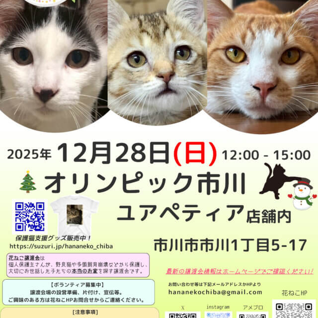 花ねこ譲渡会 募集番号:69269 掲載日:2025/11/05 開催日 2025/12/28 時間 12:00 - 15:00 場所 千葉県市川市市川1-5-17 会場名 オリンピック市川店 ユアペティア店舗内 内容 花ねこ譲渡会は、個人保護主さんが保護して大切にお世話した猫の「本当のお家」を探す譲渡会です。是非一度遊びに来てください。 ご予約は不要です。 開催日: 2025/12/28 時間: 12:00 - 15:00 場所: 千葉県市川市市川1-5-17 会場名: オリンピック市川店 ユアペティア店舗内 スポンサーリンク この譲渡会情報をSNSで広めよう! Twitterでシェア Facebookでシェア はてなブックマーク LINEで教える 投稿者:花ねこ千葉 この投稿者の情報を見る